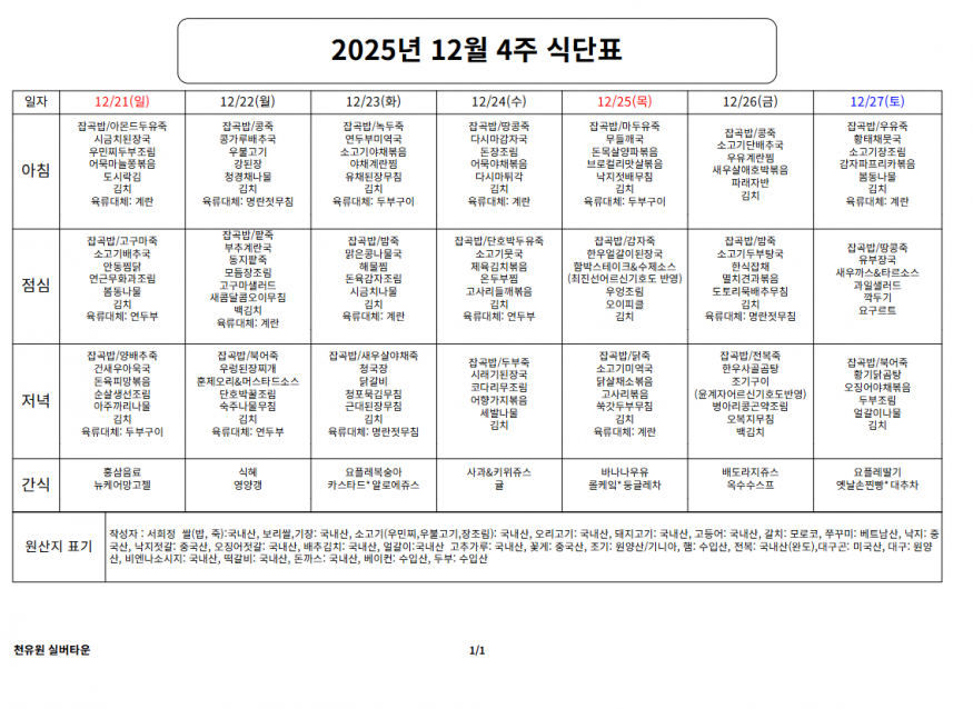 12월 4째주 식단표 페이지 정보 작성자 천유원실버타운 작성일25-12-23 10:18 조회80회 댓글0건 관련링크 이전글 다음글 목록 본문 12월 4째주 식단표 댓글목록 등록된 댓글이 없습니다. 이전글 다음글 목록