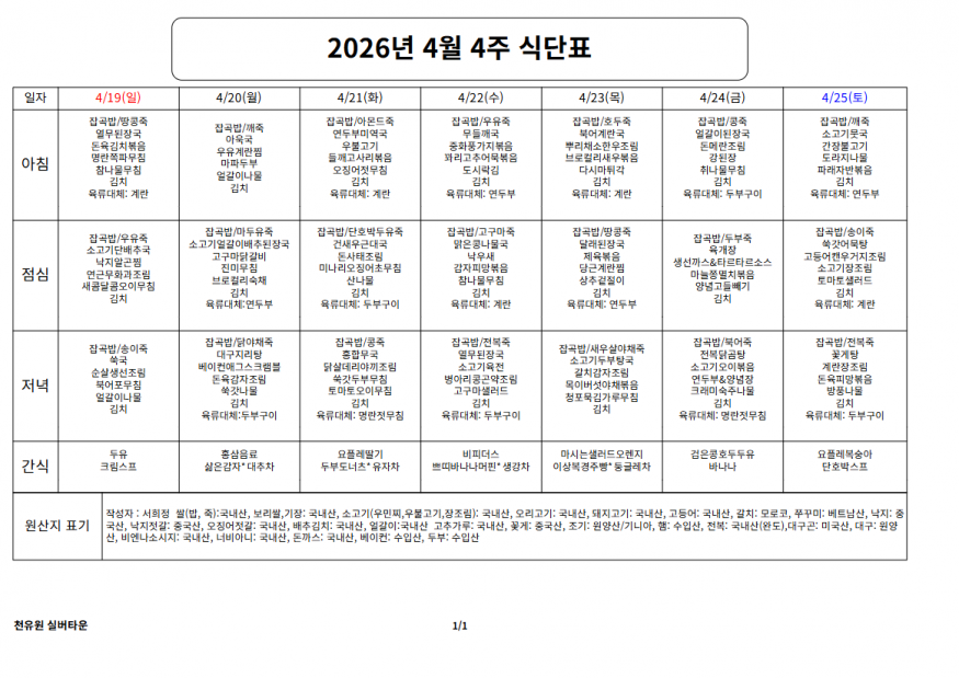 4월 4째주 식단표 페이지 정보 작성자 천유원실버타운 작성일26-04-21 14:31 조회8회 댓글0건 관련링크 이전글 다음글 목록 본문 4월 4째주 식단표 댓글목록 등록된 댓글이 없습니다. 이전글 다음글 목록