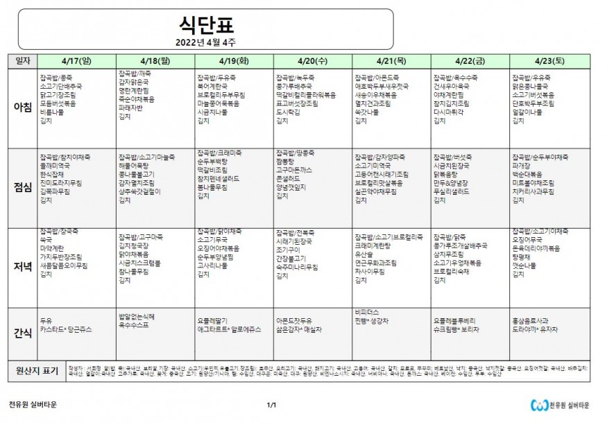 4월 4째주 식단표 페이지 정보 작성자 천유원실버타운 작성일22-04-18 09:11 조회5,701회 댓글0건 관련링크 이전글 다음글 목록 본문 4월 4째주 식단표 댓글목록 등록된 댓글이 없습니다. 이전글 다음글 목록