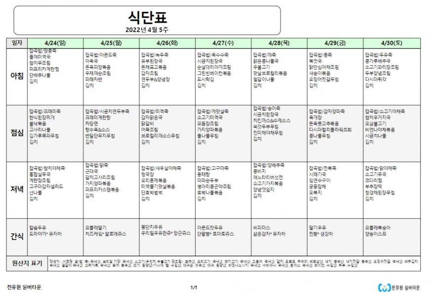 4월 5째주 식단표 페이지 정보 작성자 천유원실버타운 작성일22-04-25 07:39 조회5,738회 댓글0건 관련링크 이전글 다음글 목록 본문 4월 5째주 식단표 댓글목록 등록된 댓글이 없습니다. 이전글 다음글 목록