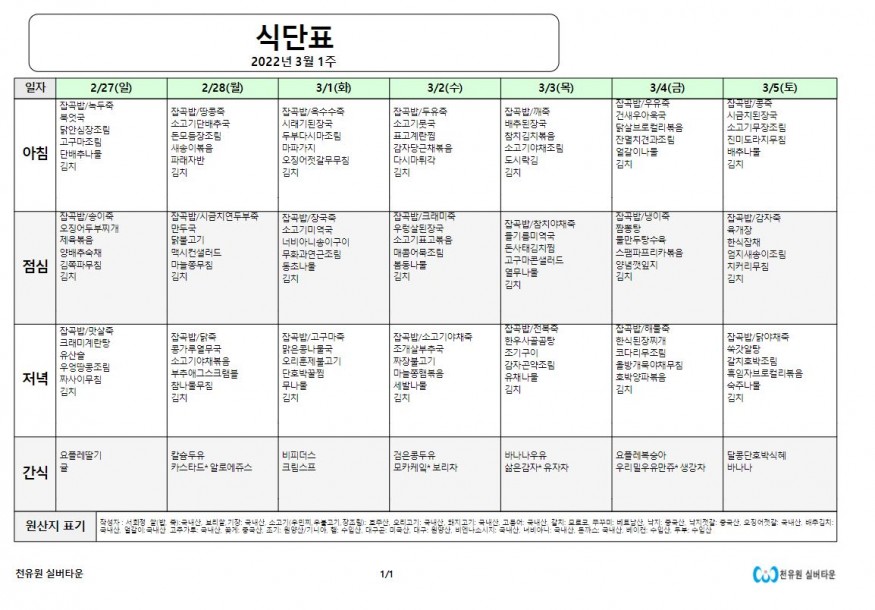 3월 1째주 식단표 페이지 정보 작성자 천유원실버타운 작성일22-02-28 08:09 조회5,665회 댓글0건 관련링크 이전글 다음글 목록 본문 3월 1째주 식단표 댓글목록 등록된 댓글이 없습니다. 이전글 다음글 목록