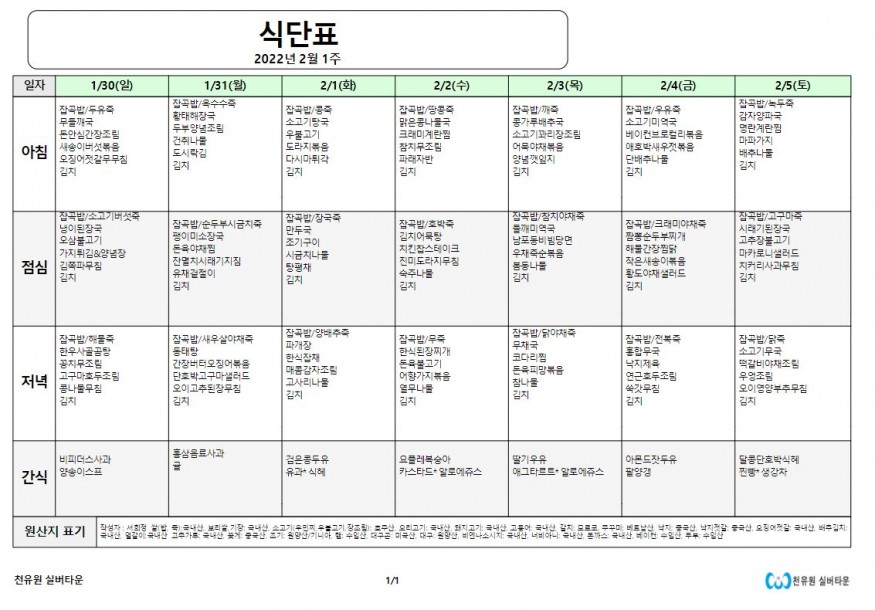 2월 1째주 식단표 페이지 정보 작성자 천유원실버타운 작성일22-02-01 07:55 조회5,704회 댓글0건 관련링크 이전글 다음글 목록 본문 2월 1째주 식단표 댓글목록 등록된 댓글이 없습니다. 이전글 다음글 목록