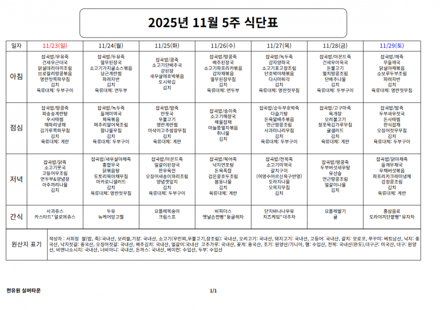 11월 5째주 식단표 페이지 정보 작성자 천유원실버타운 작성일25-11-24 16:58 조회112회 댓글0건 관련링크 이전글 다음글 목록 본문 11월 5째주 식단표 댓글목록 등록된 댓글이 없습니다. 이전글 다음글 목록