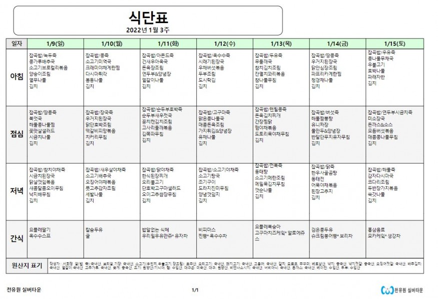 1월 3째주 식단표 페이지 정보 작성자 천유원실버타운 작성일22-01-10 08:41 조회5,699회 댓글0건 관련링크 이전글 다음글 목록 본문 1월 3째주 식단표 댓글목록 등록된 댓글이 없습니다. 이전글 다음글 목록