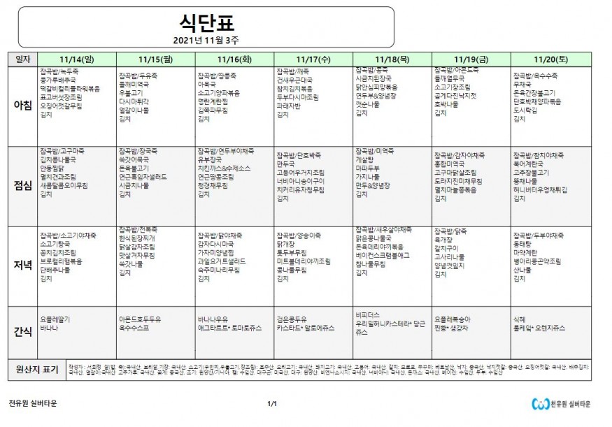 11월 3째주 식단표 페이지 정보 작성자 천유원실버타운 작성일21-11-14 09:13 조회6,874회 댓글0건 관련링크 이전글 다음글 목록 본문 11월 3째주 식단표 댓글목록 등록된 댓글이 없습니다. 이전글 다음글 목록