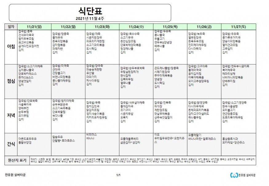 11월 4째주 식단표 페이지 정보 작성자 천유원실버타운 작성일21-11-22 09:53 조회6,870회 댓글0건 관련링크 이전글 다음글 목록 본문 11월 4째주 식단표 댓글목록 등록된 댓글이 없습니다. 이전글 다음글 목록