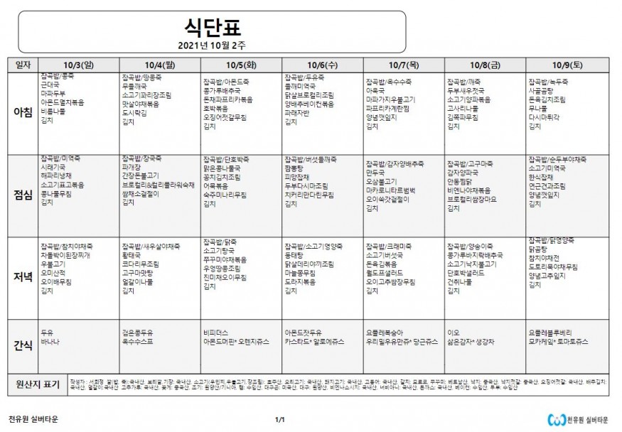 10월 2째주 식단표 페이지 정보 작성자 천유원실버타운 작성일21-10-05 08:15 조회6,054회 댓글0건 관련링크 이전글 다음글 목록 본문 10월 2째주 식단표 댓글목록 등록된 댓글이 없습니다. 이전글 다음글 목록