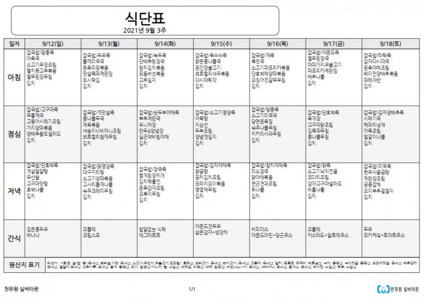 9월 3째주 식단표 페이지 정보 작성자 천유원실버타운 작성일21-09-13 08:27 조회6,046회 댓글0건 관련링크 이전글 다음글 목록 본문 9월 3째주 식단표 댓글목록 등록된 댓글이 없습니다. 이전글 다음글 목록