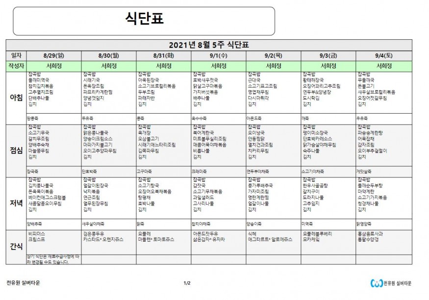 8월 5째주 식단표 페이지 정보 작성자 천유원실버타운 작성일21-08-30 08:36 조회6,120회 댓글0건 관련링크 이전글 다음글 목록 본문 8월 5째주 식단표 댓글목록 등록된 댓글이 없습니다. 이전글 다음글 목록