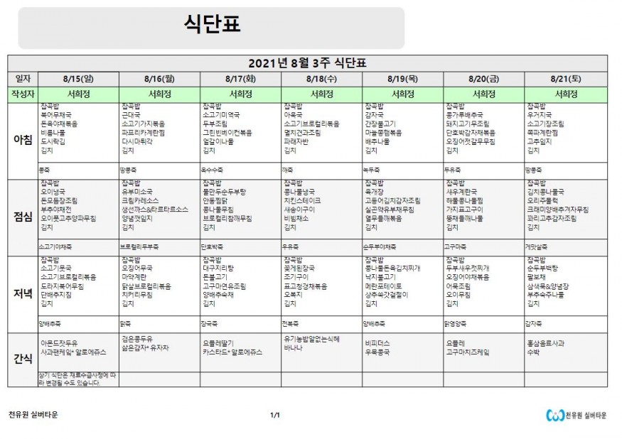 8월 3째주 식단표 페이지 정보 작성자 천유원실버타운 작성일21-08-17 08:03 조회6,076회 댓글0건 관련링크 이전글 다음글 목록 본문 8월 3째주 식단표 댓글목록 등록된 댓글이 없습니다. 이전글 다음글 목록