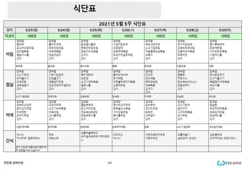 5월 5째주 식단표 페이지 정보 작성자 천유원실버타운 작성일21-05-24 13:51 조회6,144회 댓글0건 관련링크 이전글 다음글 목록 본문 5월 5째주 식단표 댓글목록 등록된 댓글이 없습니다. 이전글 다음글 목록
