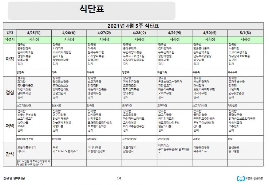 4월 5째주 식단표 페이지 정보 작성자 천유원실버타운 작성일21-04-26 09:06 조회6,189회 댓글0건 관련링크 이전글 다음글 목록 본문 4월 5째주 식단표 댓글목록 등록된 댓글이 없습니다. 이전글 다음글 목록