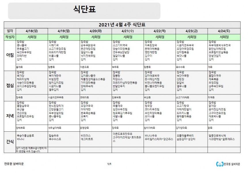 4월 4째주 식단표 페이지 정보 작성자 천유원실버타운 작성일21-04-19 08:46 조회6,191회 댓글0건 관련링크 이전글 다음글 목록 본문 4월 4째주 식단표 댓글목록 등록된 댓글이 없습니다. 이전글 다음글 목록