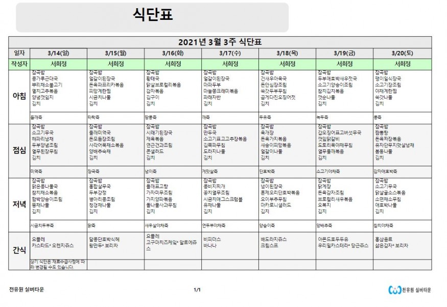 3월 3째주 식단표 페이지 정보 작성자 천유원실버타운 작성일21-03-15 08:03 조회6,456회 댓글0건 관련링크 이전글 다음글 목록 본문 3월 3째주 식단표 댓글목록 등록된 댓글이 없습니다. 이전글 다음글 목록