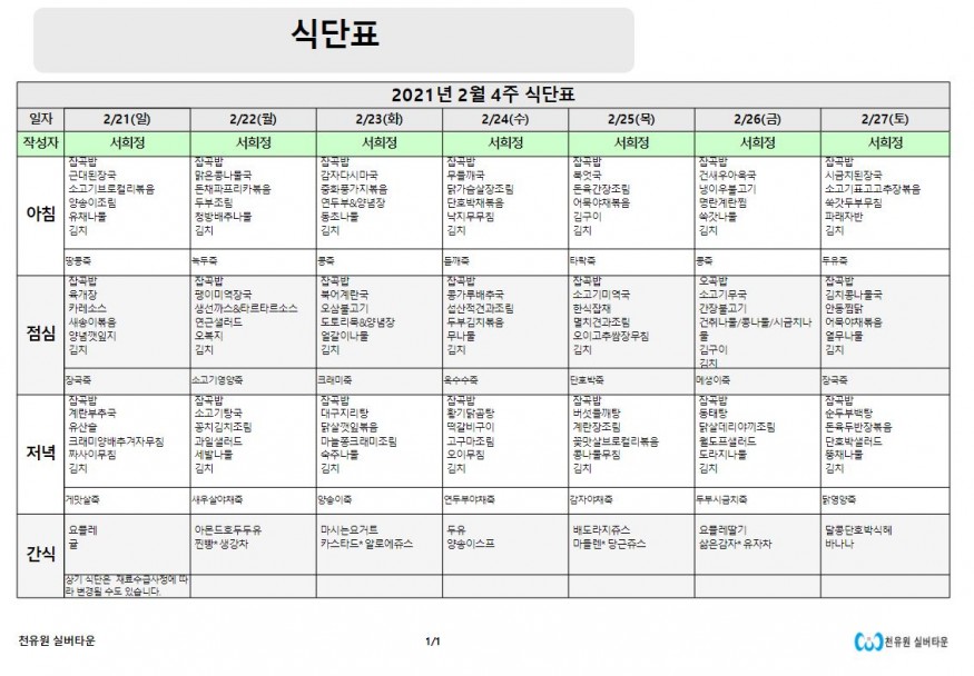 2월 4째주 식단표 페이지 정보 작성자 천유원실버타운 작성일21-02-22 08:11 조회6,306회 댓글0건 관련링크 이전글 다음글 목록 본문 2월 4째주 식단표 댓글목록 등록된 댓글이 없습니다. 이전글 다음글 목록