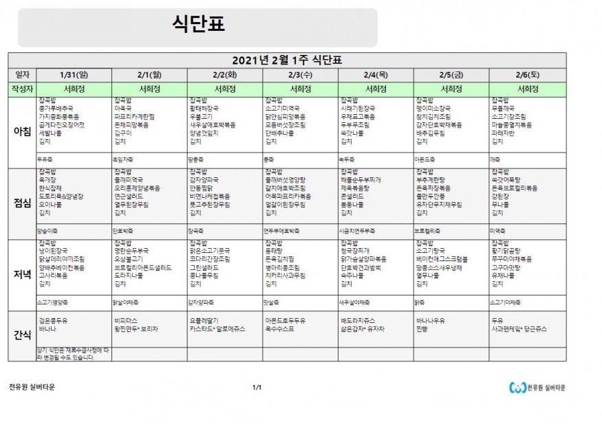 2월 1째주 식단표 페이지 정보 작성자 천유원실버타운 작성일21-02-01 08:23 조회6,475회 댓글0건 관련링크 이전글 다음글 목록 본문 2월 1째주 식단표 댓글목록 등록된 댓글이 없습니다. 이전글 다음글 목록