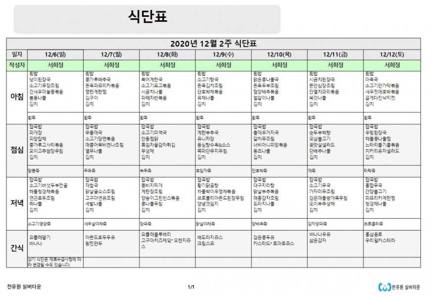 12월 2째주 식단표 페이지 정보 작성자 천유원실버타운 작성일20-12-07 07:54 조회6,378회 댓글0건 관련링크 이전글 다음글 목록 본문 12월 2째주 식단표 댓글목록 등록된 댓글이 없습니다. 이전글 다음글 목록