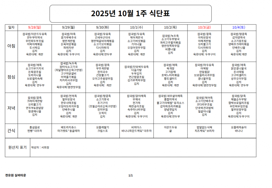 10월 1째주 식단표 페이지 정보 작성자 천유원실버타운 작성일25-10-01 16:59 조회654회 댓글0건 관련링크 이전글 다음글 목록 본문 10월 1째주 식단표 댓글목록 등록된 댓글이 없습니다. 이전글 다음글 목록