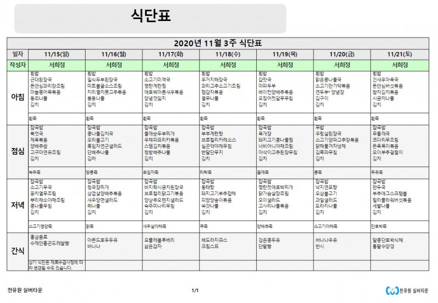 11월 3째주 식단표 페이지 정보 작성자 천유원실버타운 작성일20-11-16 10:53 조회6,894회 댓글0건 관련링크 이전글 다음글 목록 본문 11월 3째주 식단표 댓글목록 등록된 댓글이 없습니다. 이전글 다음글 목록