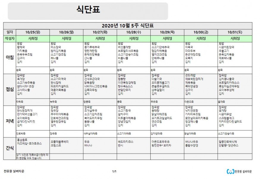 10월 5째주 식단표 페이지 정보 작성자 천유원실버타운 작성일20-10-26 08:26 조회6,420회 댓글0건 관련링크 이전글 다음글 목록 본문 10월 5째주 식단표 댓글목록 등록된 댓글이 없습니다. 이전글 다음글 목록