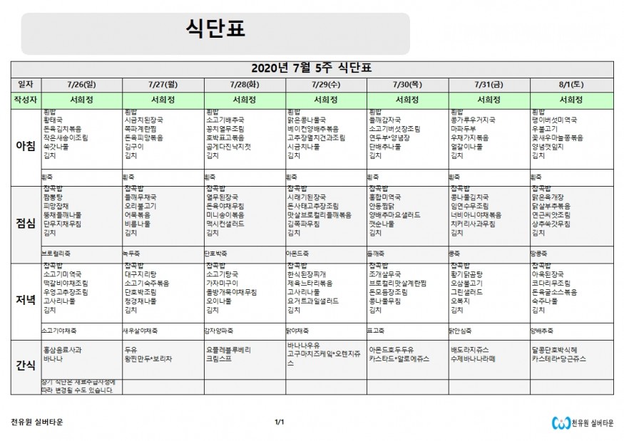 7월 5째주 식단표 페이지 정보 작성자 천유원실버타운 작성일20-07-26 14:05 조회6,347회 댓글0건 관련링크 이전글 다음글 목록 본문 7월 5째주 식단표 댓글목록 등록된 댓글이 없습니다. 이전글 다음글 목록