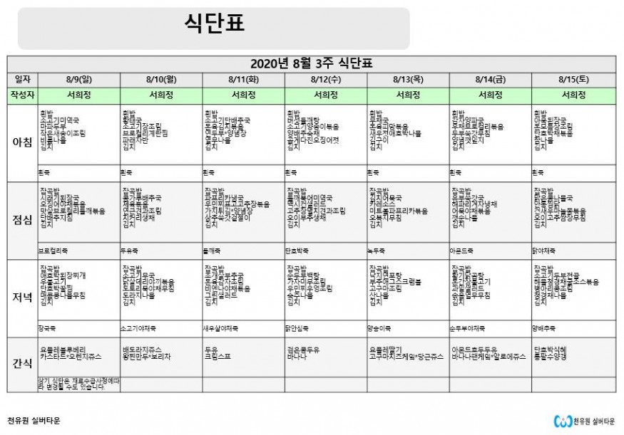 8월 3째주 식단표 페이지 정보 작성자 천유원실버타운 작성일20-08-09 15:15 조회6,271회 댓글0건 관련링크 이전글 다음글 목록 본문 8월 3째주 식단표 댓글목록 등록된 댓글이 없습니다. 이전글 다음글 목록