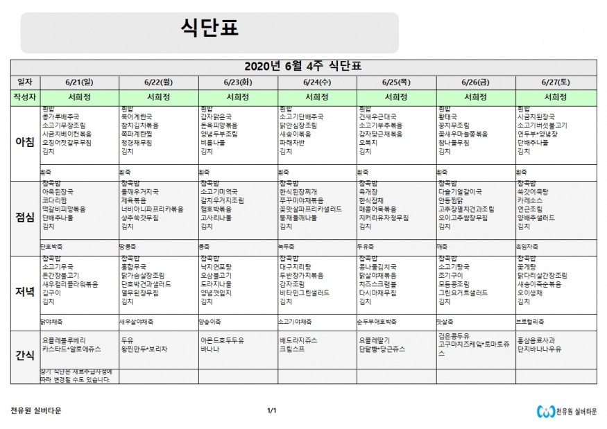 6월 4째주 식단표 페이지 정보 작성자 천유원실버타운 작성일20-06-22 07:25 조회6,508회 댓글0건 관련링크 이전글 다음글 목록 본문 6월 4째주 식단표 댓글목록 등록된 댓글이 없습니다. 이전글 다음글 목록