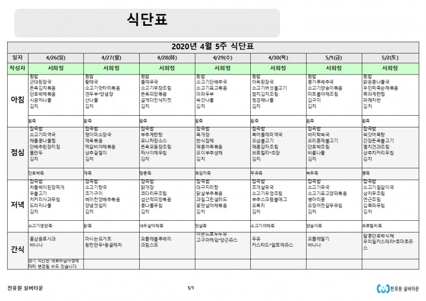 4월 5째주 식단표 페이지 정보 작성자 천유원실버타운 작성일20-04-27 07:46 조회6,465회 댓글0건 관련링크 이전글 다음글 목록 본문 4월 5째주 식단표 댓글목록 등록된 댓글이 없습니다. 이전글 다음글 목록