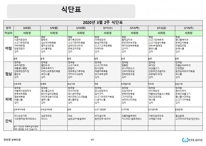 3월 2째주 식단표 페이지 정보 작성자 천유원실버타운 작성일20-03-08 08:58 조회6,436회 댓글0건 관련링크 이전글 다음글 목록 본문 3월 2째주 식단표 댓글목록 등록된 댓글이 없습니다. 이전글 다음글 목록