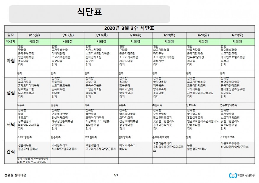 3월 3째주 식단표 페이지 정보 작성자 천유원실버타운 작성일20-03-15 08:53 조회6,333회 댓글0건 관련링크 이전글 다음글 목록 본문 3월 3째주 식단표 댓글목록 등록된 댓글이 없습니다. 이전글 다음글 목록