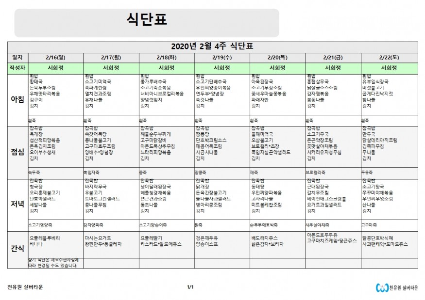 2월 4째주 식단표 페이지 정보 작성자 천유원실버타운 작성일20-02-17 08:29 조회6,431회 댓글0건 관련링크 이전글 다음글 목록 본문 2월 4째주 식단표 댓글목록 등록된 댓글이 없습니다. 이전글 다음글 목록