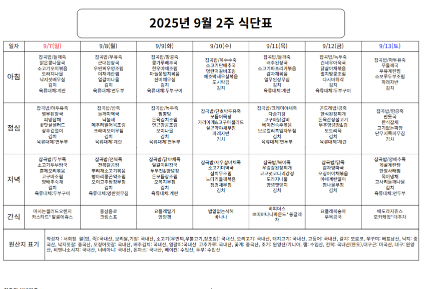9월 2째주 식단표 페이지 정보 작성자 천유원실버타운 작성일25-09-08 10:42 조회973회 댓글0건 관련링크 이전글 다음글 목록 본문 9월 2째주 식단표 댓글목록 등록된 댓글이 없습니다. 이전글 다음글 목록