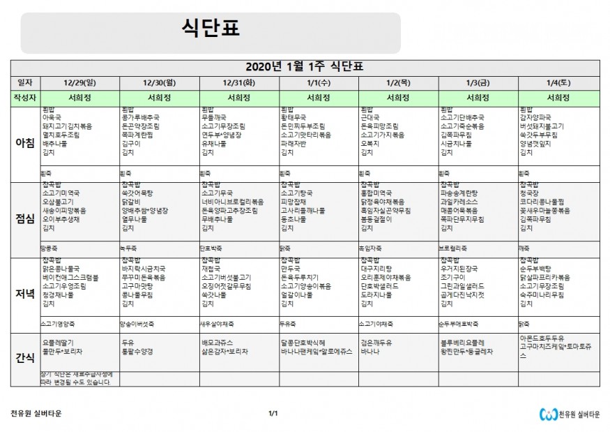 2020년 1월 1째주 식단표 페이지 정보 작성자 천유원실버타운 작성일19-12-30 10:14 조회6,512회 댓글0건 관련링크 이전글 다음글 목록 본문 2020년 1월 1째주 식단표 댓글목록 등록된 댓글이 없습니다. 이전글 다음글 목록