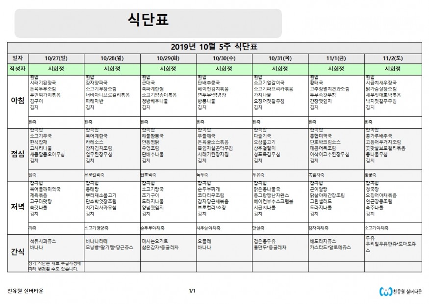 10월 5째주 식단표 페이지 정보 작성자 천유원실버타운 작성일19-10-28 13:05 조회6,763회 댓글0건 관련링크 이전글 다음글 목록 본문 10월 5째주 식단표 댓글목록 등록된 댓글이 없습니다. 이전글 다음글 목록