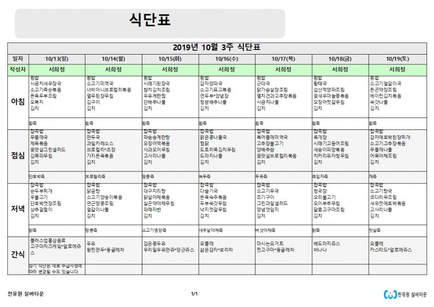10월 3째주 식단표 페이지 정보 작성자 천유원실버타운 작성일19-10-14 09:23 조회6,420회 댓글0건 관련링크 이전글 다음글 목록 본문 10월 3째주 식단표 댓글목록 등록된 댓글이 없습니다. 이전글 다음글 목록