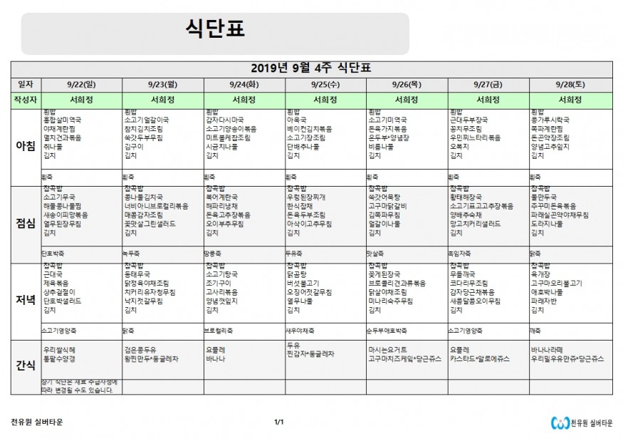 9월 4째주 식단표 페이지 정보 작성자 천유원실버타운 작성일19-09-23 08:26 조회6,577회 댓글0건 관련링크 이전글 다음글 목록 본문 9월 4째주 식단표 댓글목록 등록된 댓글이 없습니다. 이전글 다음글 목록