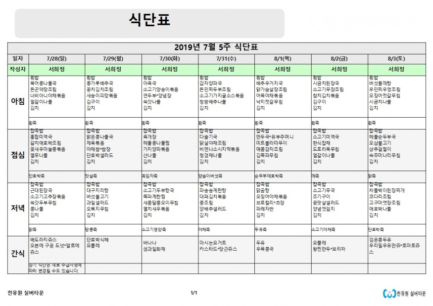 7월 5째주 식단표 페이지 정보 작성자 천유원실버타운 작성일19-07-29 10:38 조회6,632회 댓글0건 관련링크 이전글 다음글 목록 본문 7월 5째주 식단표 댓글목록 등록된 댓글이 없습니다. 이전글 다음글 목록