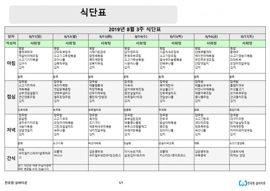 8월 3째주 식단표 페이지 정보 작성자 천유원실버타운 작성일19-08-13 10:13 조회6,561회 댓글0건 관련링크 이전글 다음글 목록 본문 8월 3째주 식단표 댓글목록 등록된 댓글이 없습니다. 이전글 다음글 목록