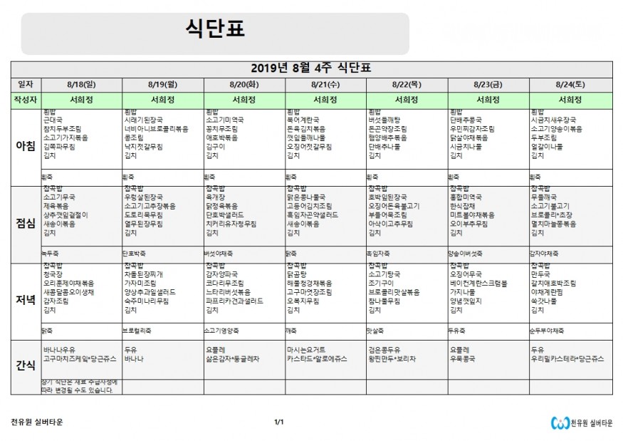 8월 4째주 식단표 페이지 정보 작성자 천유원실버타운 작성일19-08-19 13:39 조회6,535회 댓글0건 관련링크 이전글 다음글 목록 본문 8월 4째주 식단표 댓글목록 등록된 댓글이 없습니다. 이전글 다음글 목록
