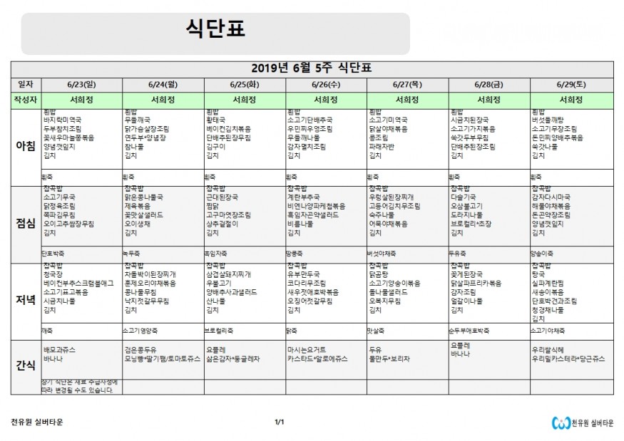 6월 5째주 식단표 페이지 정보 작성자 천유원실버타운 작성일19-06-24 10:38 조회6,595회 댓글0건 관련링크 이전글 다음글 목록 본문 6월 5째주 식단표 댓글목록 등록된 댓글이 없습니다. 이전글 다음글 목록