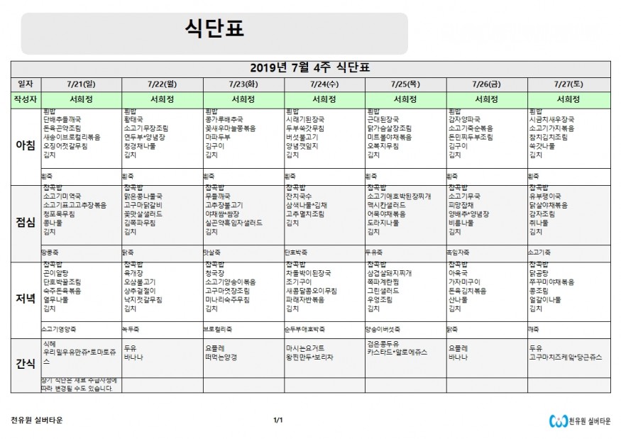 7월 4째주 식단표 페이지 정보 작성자 천유원실버타운 작성일19-07-22 10:20 조회6,499회 댓글0건 관련링크 이전글 다음글 목록 본문 7월 4째주 식단표 댓글목록 등록된 댓글이 없습니다. 이전글 다음글 목록