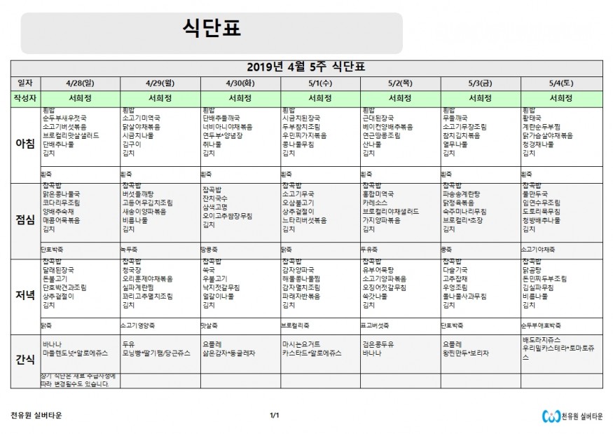 4월5째주 식단표 페이지 정보 작성자 천유원실버타운 작성일19-04-29 16:22 조회6,470회 댓글0건 관련링크 이전글 다음글 목록 본문 4월 5째주 식단표 댓글목록 등록된 댓글이 없습니다. 이전글 다음글 목록