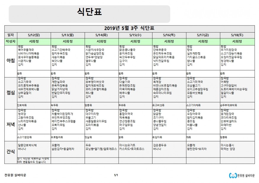 5월 3째주 식단표 페이지 정보 작성자 천유원실버타운 작성일19-05-13 10:59 조회6,350회 댓글0건 관련링크 이전글 다음글 목록 본문 5월 3째주 식단표 댓글목록 등록된 댓글이 없습니다. 이전글 다음글 목록