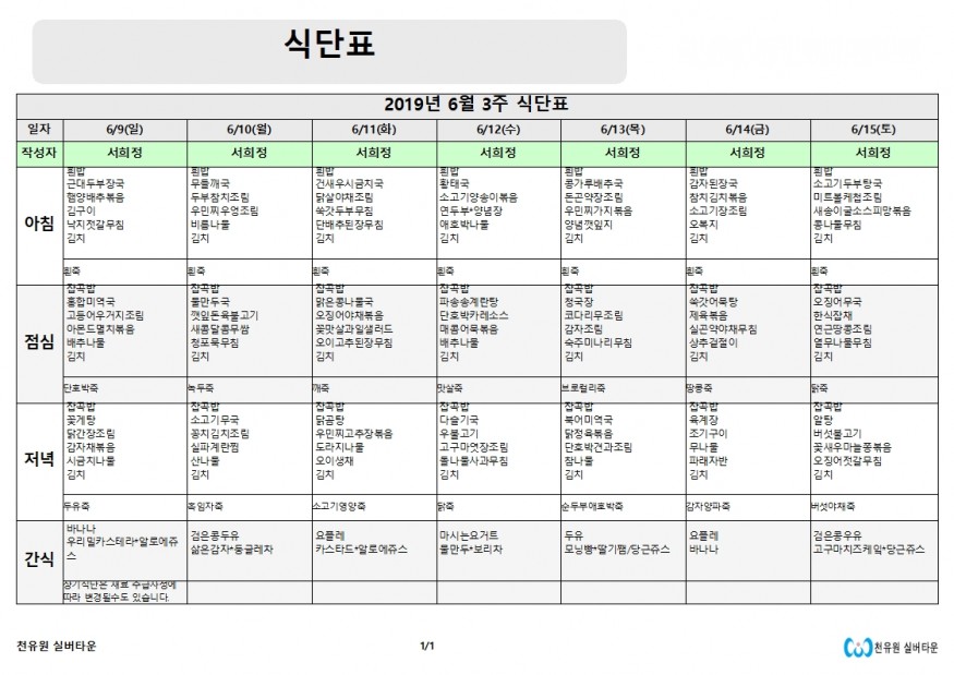 6월 3째주 식단표 페이지 정보 작성자 천유원실버타운 작성일19-06-10 08:30 조회6,435회 댓글0건 관련링크 이전글 다음글 목록 본문 6월 3째주 식단표 댓글목록 등록된 댓글이 없습니다. 이전글 다음글 목록