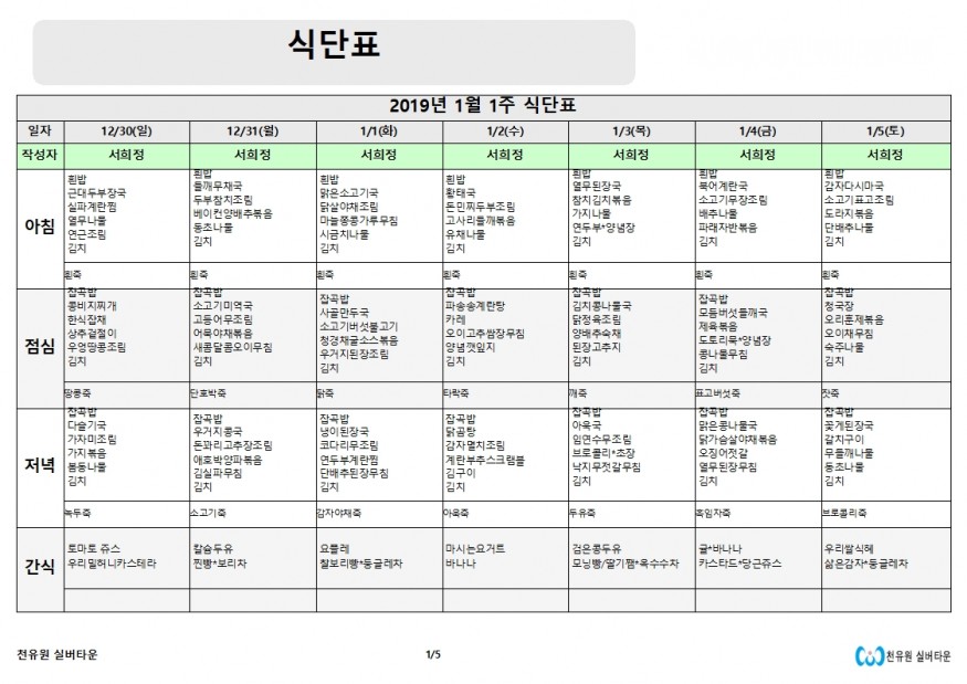 2019년1월1째주 식단표 페이지 정보 작성자 천유원실버타운 작성일19-01-03 08:58 조회6,592회 댓글0건 관련링크 이전글 다음글 목록 본문 2019년 1월 1째주 식단표 댓글목록 등록된 댓글이 없습니다. 이전글 다음글 목록