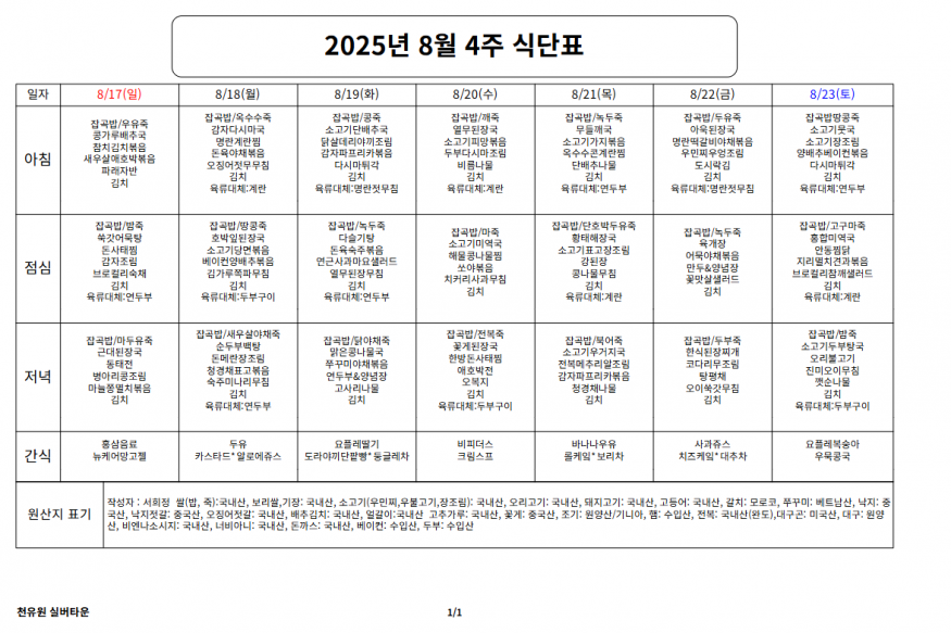 8월 4째주 식단표 페이지 정보 작성자 천유원실버타운 작성일25-08-18 14:00 조회1,285회 댓글0건 관련링크 이전글 다음글 목록 본문 8월 4째주 식단표 댓글목록 등록된 댓글이 없습니다. 이전글 다음글 목록