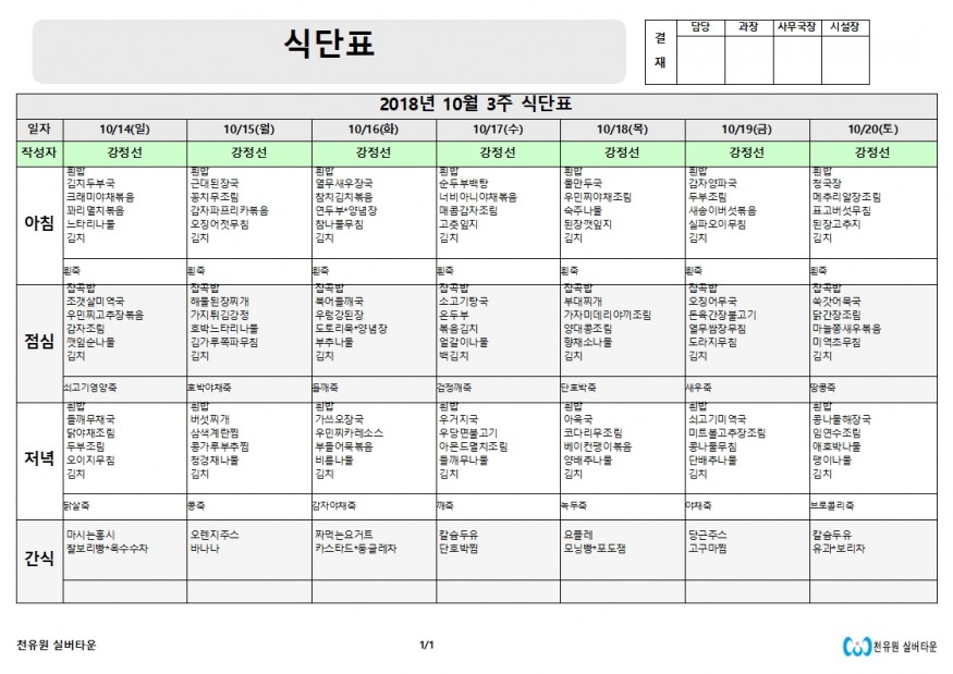 10월3째주 식단표 페이지 정보 작성자 천유원실버타운 작성일18-10-15 12:15 조회6,484회 댓글0건 관련링크 이전글 다음글 목록 본문 10월3째주 식단표 댓글목록 등록된 댓글이 없습니다. 이전글 다음글 목록