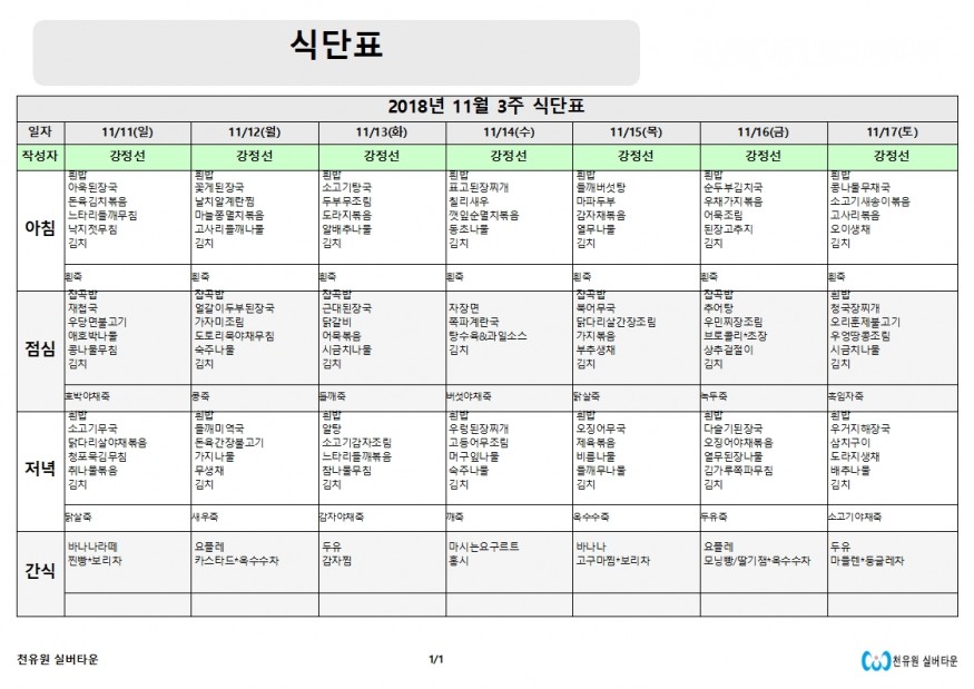 11월3째주 식단표 페이지 정보 작성자 천유원실버타운 작성일18-11-09 17:48 조회7,304회 댓글0건 관련링크 이전글 다음글 목록 본문 11월3째주 식단표 댓글목록 등록된 댓글이 없습니다. 이전글 다음글 목록