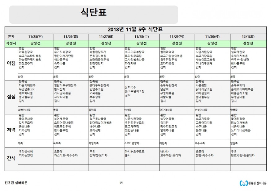 11월5째주 식단표 페이지 정보 작성자 천유원실버타운 작성일18-11-26 10:50 조회7,145회 댓글0건 관련링크 이전글 다음글 목록 본문 11월5째주 식단표 댓글목록 등록된 댓글이 없습니다. 이전글 다음글 목록