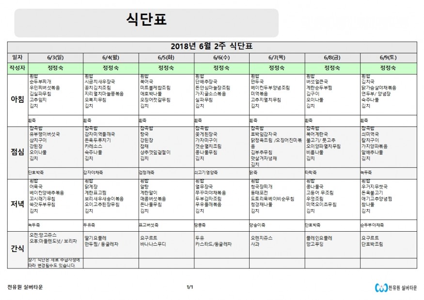 6월 2주 식단표 페이지 정보 작성자 천유원실버타운 작성일18-06-05 17:59 조회6,719회 댓글0건 관련링크 이전글 다음글 목록 본문 6월 둘째주 식단표 입니다. 댓글목록 등록된 댓글이 없습니다. 이전글 다음글 목록